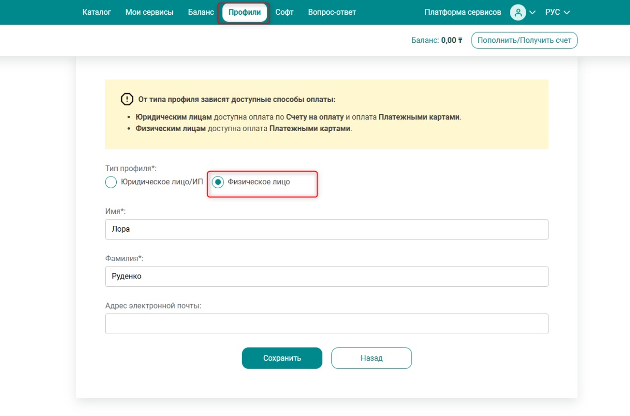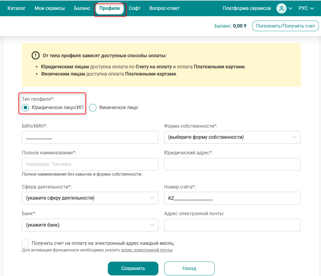 После регистрации пользователя необходимо зарегистрировать Профиль, по которому будут производиться взаиморасчеты.