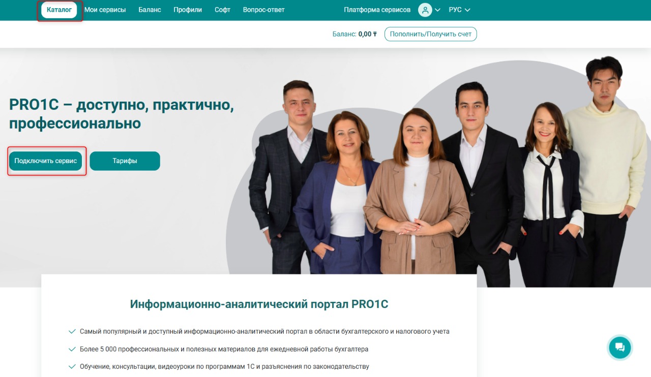 Перейти в каталог сервисов, выбрать Информационно-аналитический портал PRO1C, ознакомиться с информацией и тарифами. После нажать Подключить сервис: