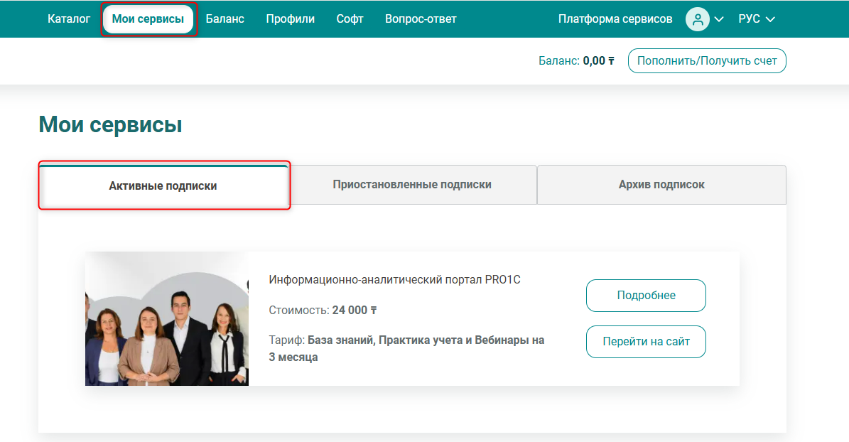 Перейти на PRO1C.kz можно из раздела Мои сервисы, либо авторизоваться на PRO1C.kz с помощью логина и пароля, указанных при регистрации на платформе сервисов.